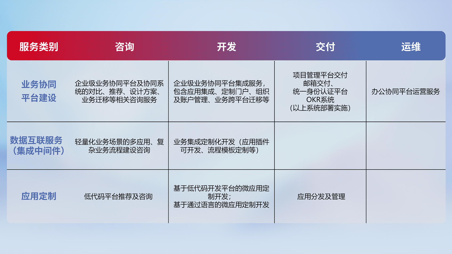 针对钉钉、、企微、、IDaas等平台级产品提供产品的规划、、、、方案、、、、交付、、定制化开发等服务,,实现如统一协同办公、、、智能客户服务、、、、混合会议管理、、智能数据查询、、、等业务场景,,,实现数字化转型。。