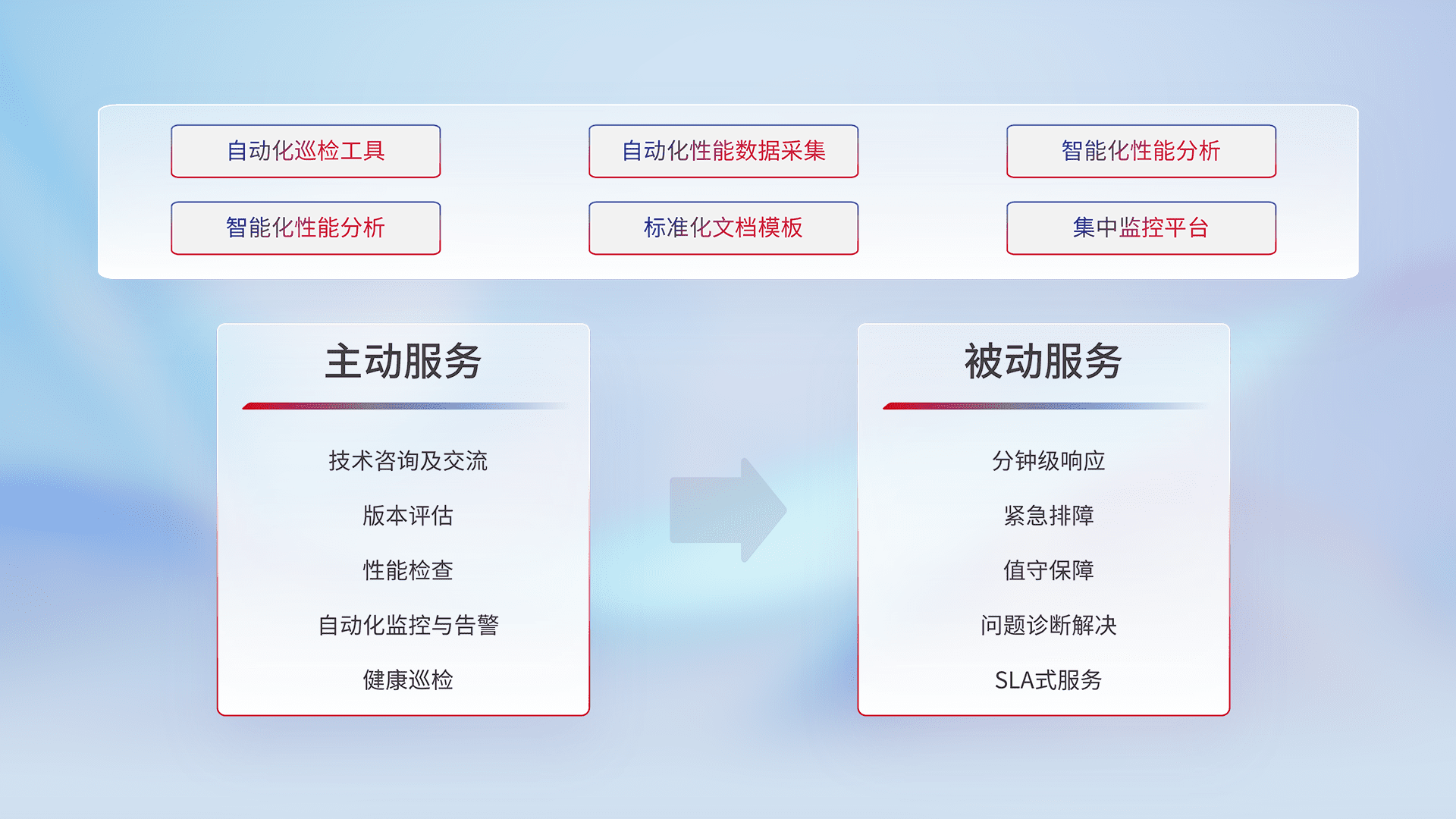 智能化工具和标准化文档,,,,保障服务质量,,提供主动服务(包含技术咨询、、、版本评估、、、性能检查、、、自动化监控与告警、、、健康巡检)和被动服务包含(分钟级响应、、紧急排障、、值守保障、、问题诊断解决、、、、SLA服务)。。。。